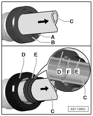 Beginning with MY 2010, as a running change, the quick-release coupling - D - installed and the refrigerant line - C - are being installed in the same manner as the quick-release coupling - A -. If the refrigerant line - C - is pulled in the direction of arrow after assembling, the ring - E - will come out of the quick-release coupling - D - and will show that the retaining ring - F - is completely latched to the refrigerant line - C -. Then the ring - E - can be removed from the refrigerant line - C -.