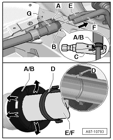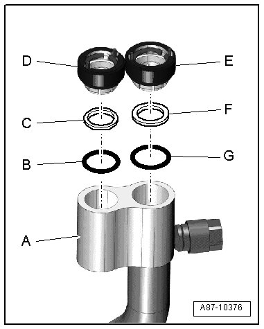 - Replace the O-rings - B and G -, the support rings - C and F - and the couplings - D and E -. Refer to Electronic Parts Catalog (ETKA).
