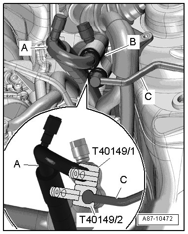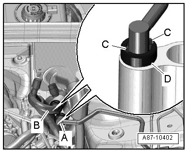- Remove the refrigerant line - A - using the release tool for air conditioner coupling from the connector piece - B - of the refrigerant line with inner heat exchanger.