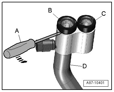 - Pry the couplings - B - and - C - using a screwdriver - A - out of the refrigerant line - D - with inner heat exchanger - arrow -.