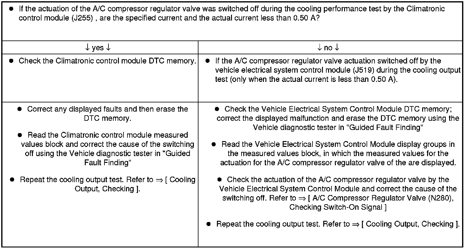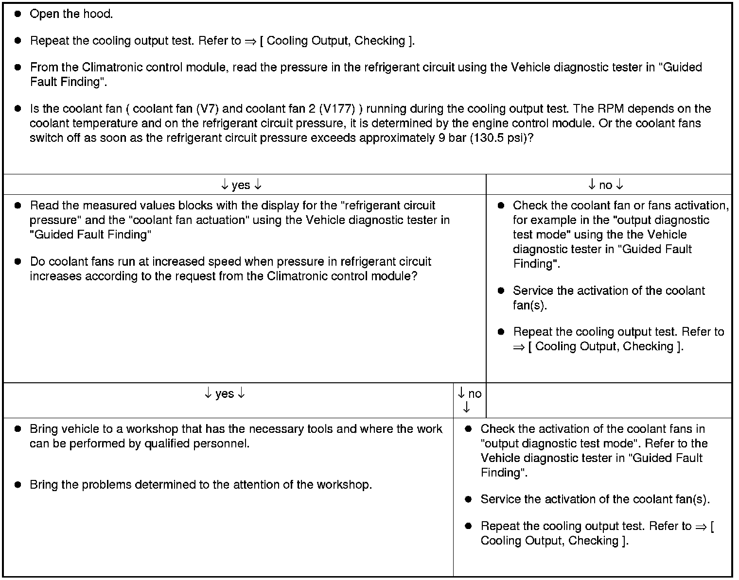If the pressure in the refrigerant circuit or the engine coolant temperature is too high, the Climatronic control module regulates the compressor performance (to avoid sudden A/C compressor cut-off). As soon as pressure in refrigerant circuit exceeds 30 bar (435 psi) (absolute pressure), full A/C compressor performance is only enabled again after pressure has become less than 27 bar (391 psi), or coolant temperature exceeds 115 °C (239 °F) (it is switched off completely at 118 °C (244 °F)).