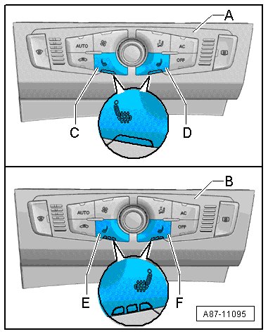 • Both versions - A - and - B - are on the "Basis" when installed. Only the seat heating buttons are different (when installed, there are no noticeable differences on vehicles without seat heating). The seat symbols in the buttons - C - and - D - point in different directions on the Climatronic control module - A - installed from start of production. The seat symbols in buttons - C - and - D - face the same direction the Climatronic control module - B - from MY 12. The version - B - Climatronic control module has 3 seat heating settings (version - A - has 6 settings). The selected seat heating setting will be turned down one setting after a certain period of time (refer to the Owner's Manual).