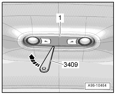 - Carefully pry off interior/reading lamp - 1 - out of roof cutout - arrow - using trim removal wedge (3409).