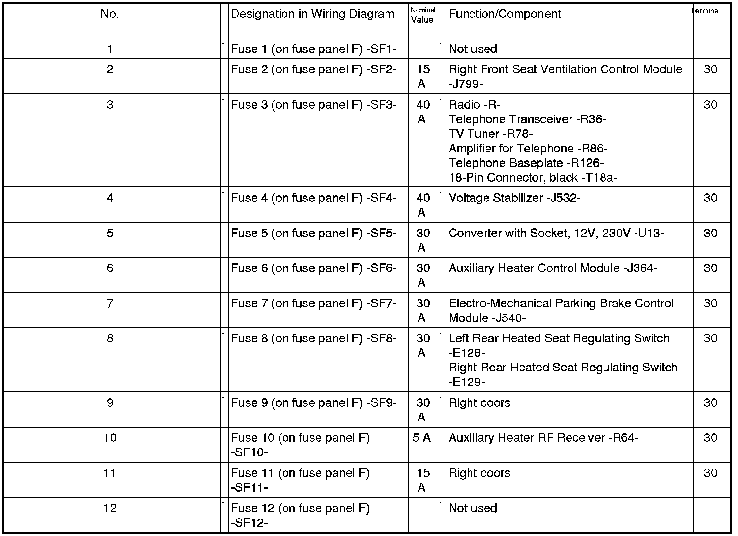 Fuses in Fuse Carrier ST2 on Fuse Panel F -SF- (black)