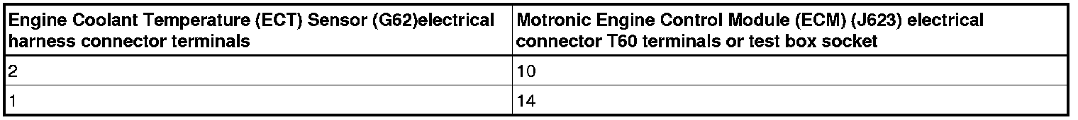 - Using a Multimeter, check the Engine Coolant Temperature (ECT) Sensor (G62) electrical harness connector terminals to the Motronic Engine Control Module (ECM) (J623) electrical harness connector T60 terminals for resistance.
