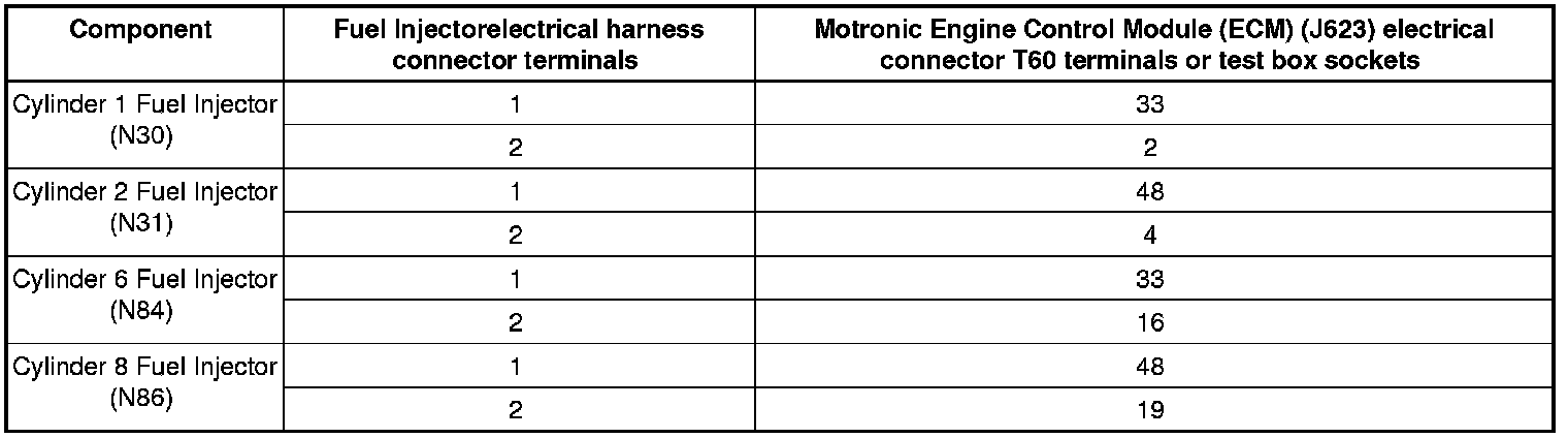- Using a Multimeter, check the electrical harness connector terminals of the Fuel Injector to be tested to the Motronic Engine Control Module (ECM) (J623) electrical harness connector T60 terminals for resistance.