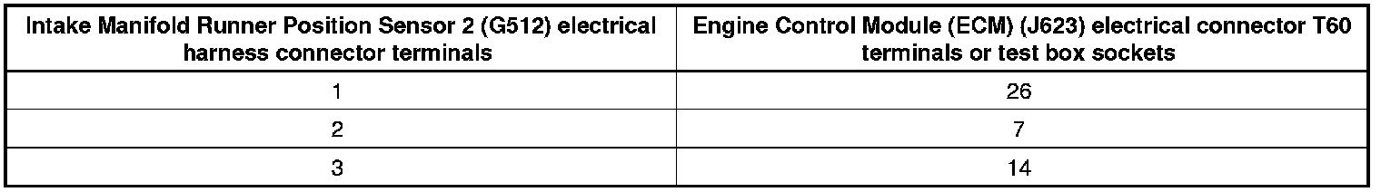 - Using a multimeter, check the Intake Manifold Runner Position Sensor 2 (G512) electrical harness connector terminals to the Engine Control Module (ECM) (J623) electrical harness connector T60 terminals for resistance.