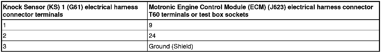 - Using a Multimeter, Check the Knock Sensor (KS) 1 (G61) electrical harness connector to the Motronic Engine Control Module (ECM) (J623) electrical harness connector T60 for resistance.