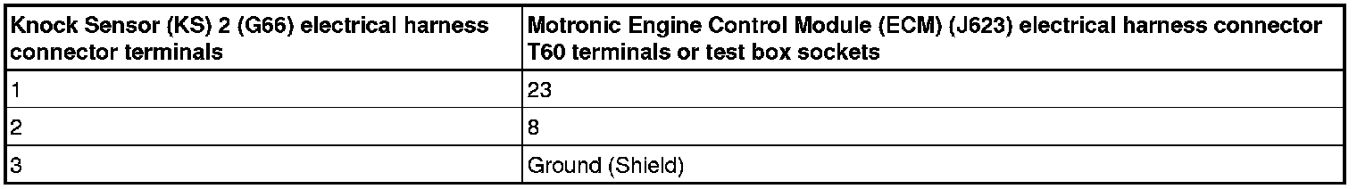 - Using a Multimeter, Check the Knock Sensor (KS) 2 (G66) electrical harness connector to the Motronic Engine Control Module (ECM) (J623) electrical harness connector T60 for resistance.
