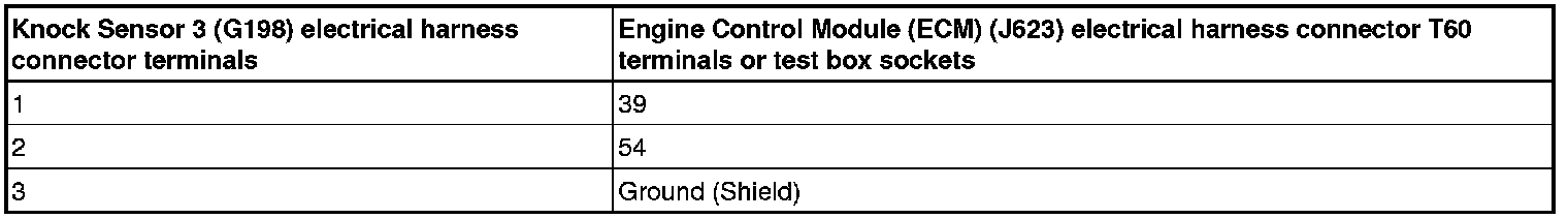 - Using a Multimeter, Check the Knock Sensor 3 (G198) electrical harness connector to the Engine Control Module (ECM) (J623) electrical harness connector T60 for resistance.