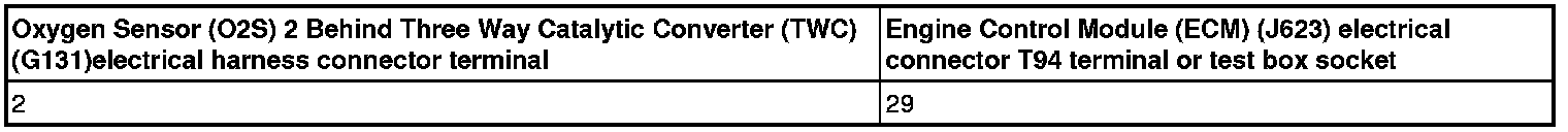 - Using a multimeter, check the Oxygen Sensor (O2S) 2 Behind Three Way Catalytic Converter (TWC) (G131) electrical harness connector to the Engine Control Module (ECM) (J623) electrical harness connector T94 for resistance.