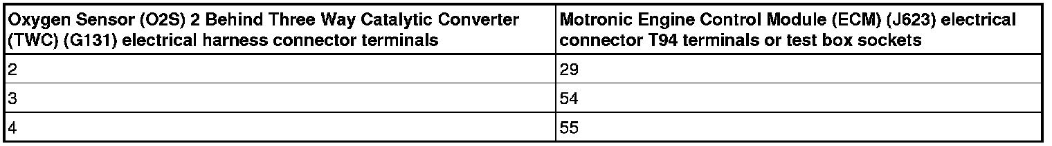 - Using a Multimeter, check the Oxygen Sensor (O2S) 2 Behind Three Way Catalytic Converter (TWC) (G131) electrical harness connector terminals to the Motronic Engine Control Module (ECM) (J623) electrical harness connector T94 terminals for resistance.