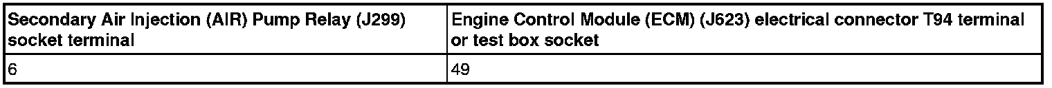 - Using a Multimeter, check the Secondary Air Injection (AIR) Pump Relay (J299) socket 6 to the Engine Control Module (ECM) (J623) electrical harness connector T94 terminal 49 for resistance.