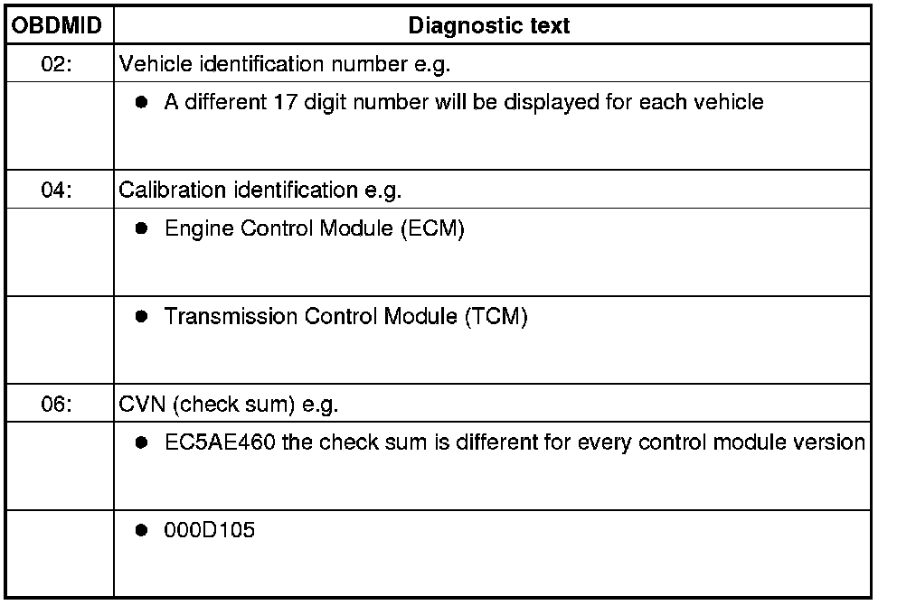 Diagnostic Mode 09 makes it possible to access vehicle-specific information from the ECM and the TCM (where applicable).