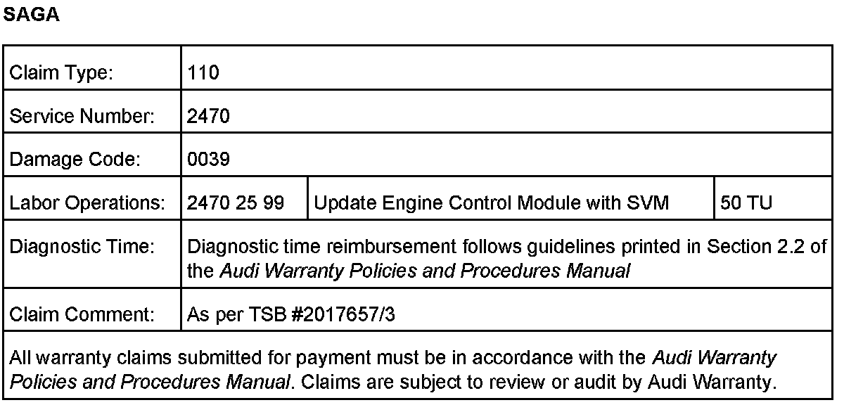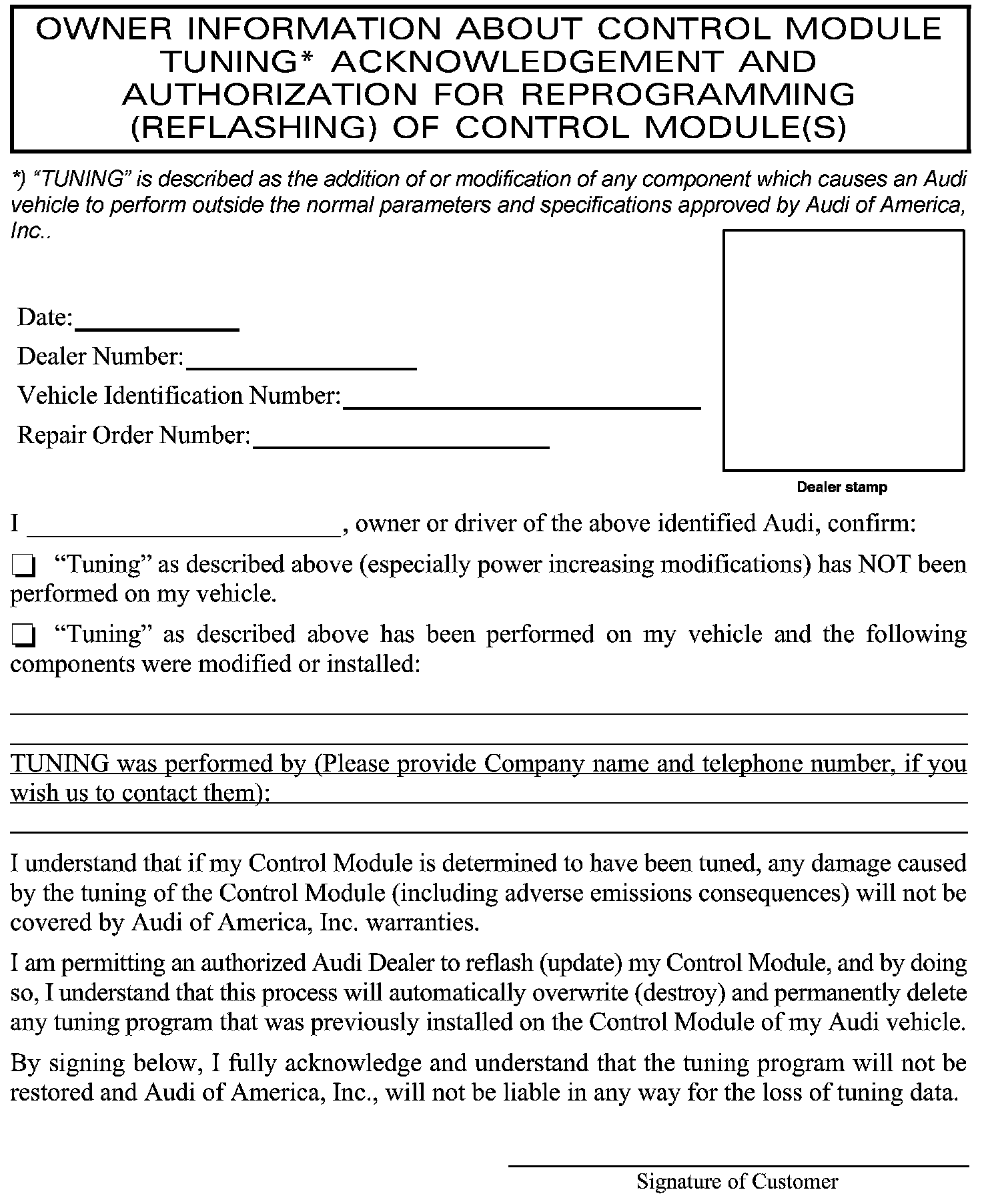 Any Update Programming procedure (flash) may overwrite any tuned ECM or TCM programming. A tuned ECM or TCM is described as any ECM or TCM altered so as to perform outside the normal parameters and specifications approved by Audi of America, Inc.