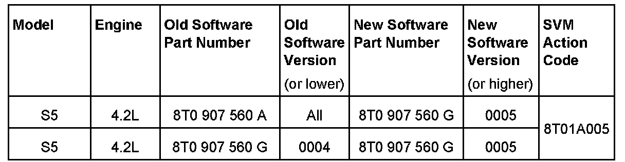 5. Update the Engine Control Module (J623) using SVM action code as listed in the table below if necessary. If the vehicle has a tuned ECM or TCM, ensure the Control Module Tuning form has been filled out by the owner.