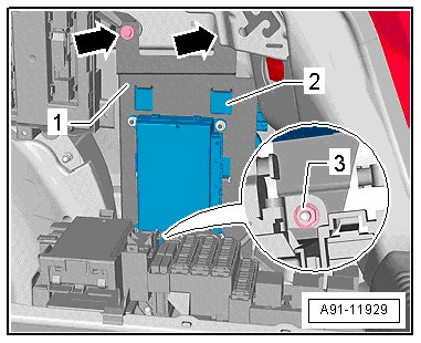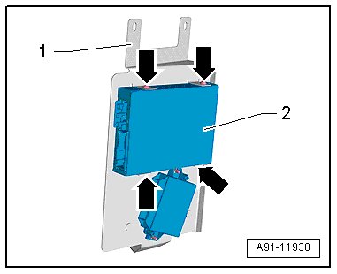 - Remove the bracket - 1 - from the storage compartment and disconnect the connectors from the modules.