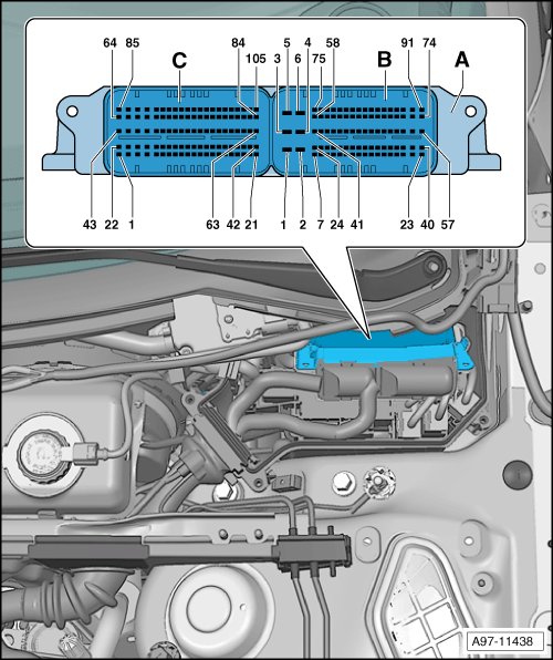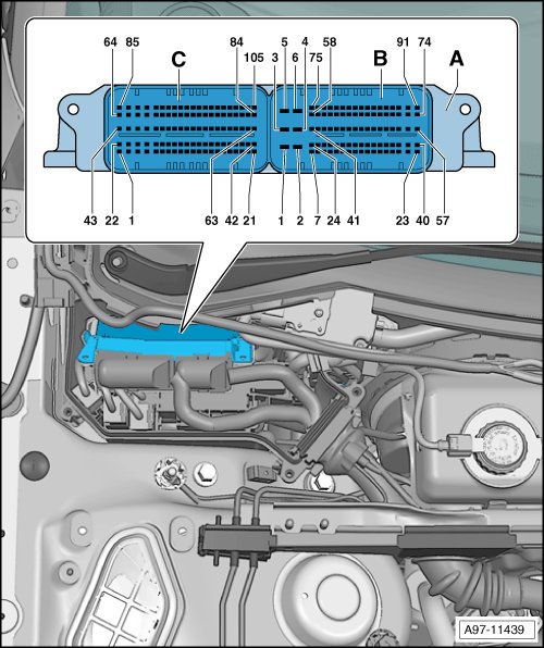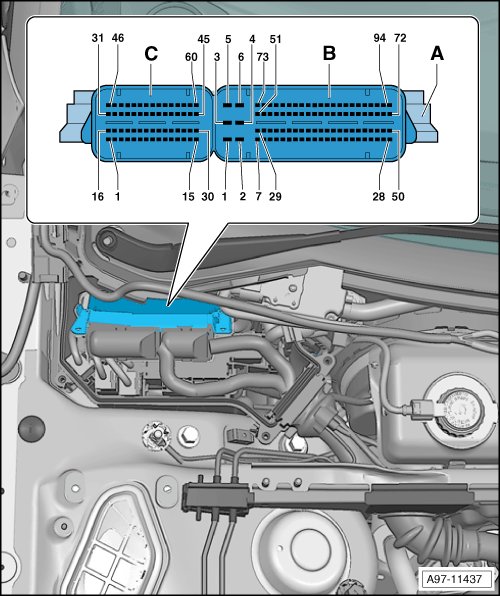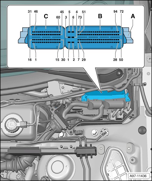 Component Location Engine Control Module (ECM) -J623- for models with left-hand drive (with -T60- and -T94- ):