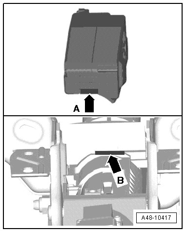 - Install the electronic steering column lock control module. Make sure the tab - arrow A - fits into the groove - arrow B - in the steering column and then push the electronic steering column lock control module firmly onto the steering column.