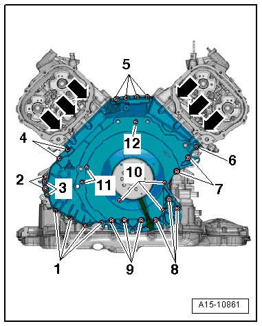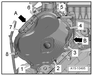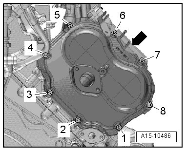 - Tighten right timing chain cover bolts to 9 Nm in - 1 to 8 - sequence.