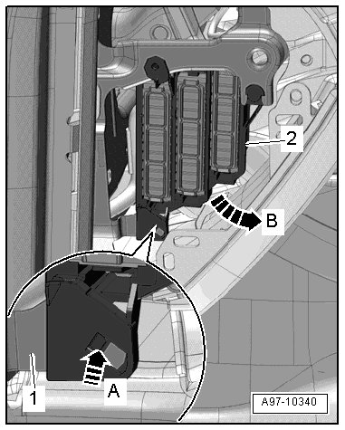 - Open the clips - arrow A - and remove fuse panel C - 2 - in - direction of arrow B - on the central tube - 1 - for the instrument panel.