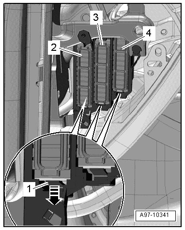 - Open the clips - 1 - in - direction of arrow - and push the fuse carriers - 2 through 4 - out of fuse panel C.