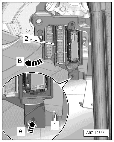 - Open the clips - arrow A - and remove fuse panel D - 2 - in - direction of arrow B - on the central tube - 1 - for the instrument panel.