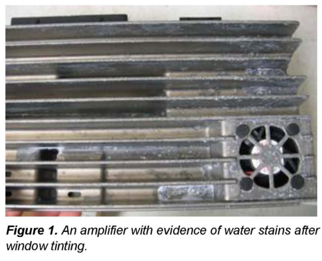 2. If confirmed, the source of the water must be found and corrected to prevent a repeat repair. If the windows were not tinted, check for potential leaks around the trunk seal. Spray the vehicle and thoroughly check the amplifier area for water drops.