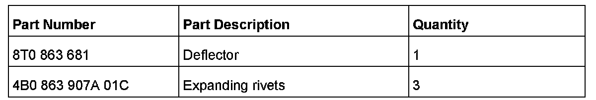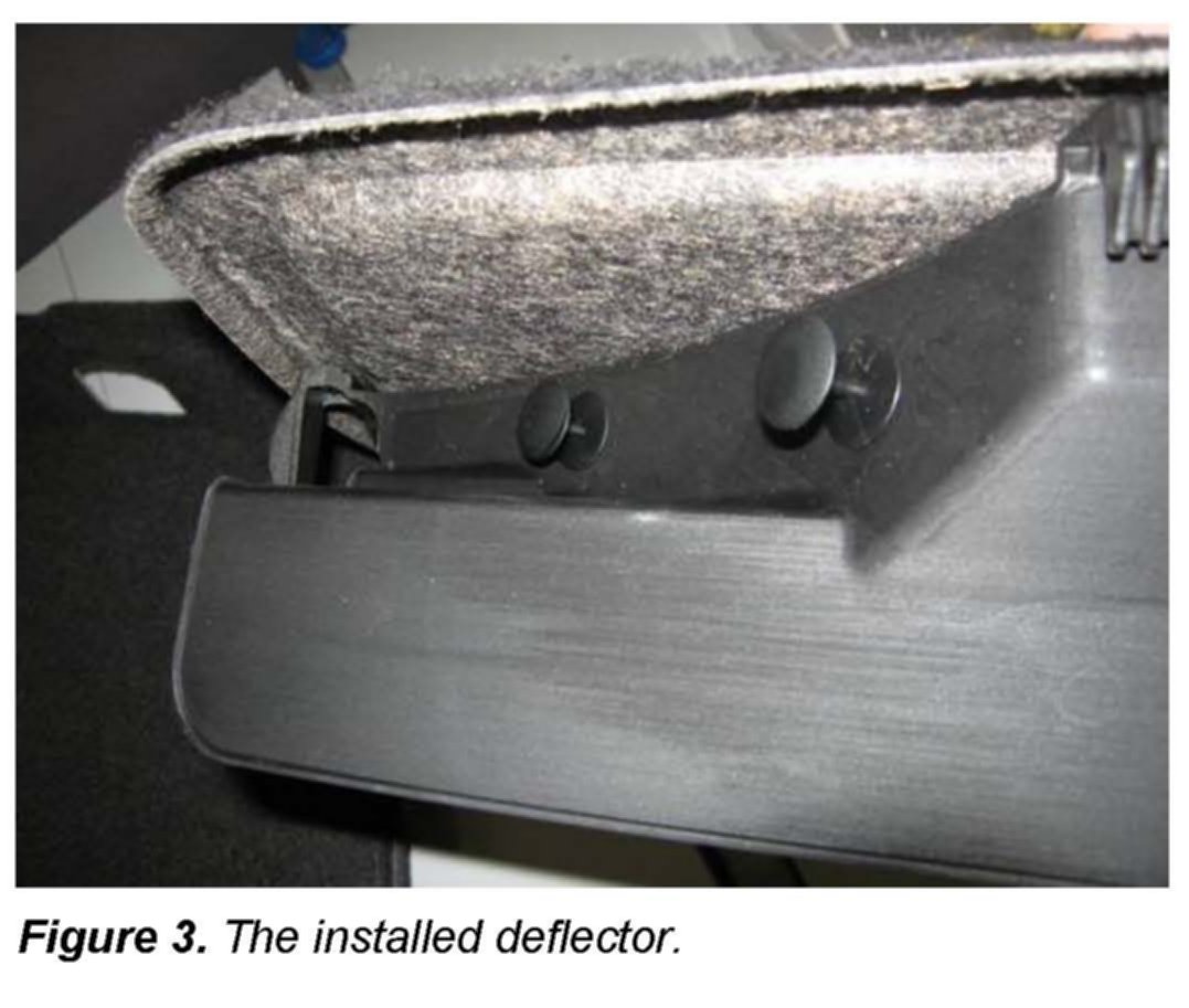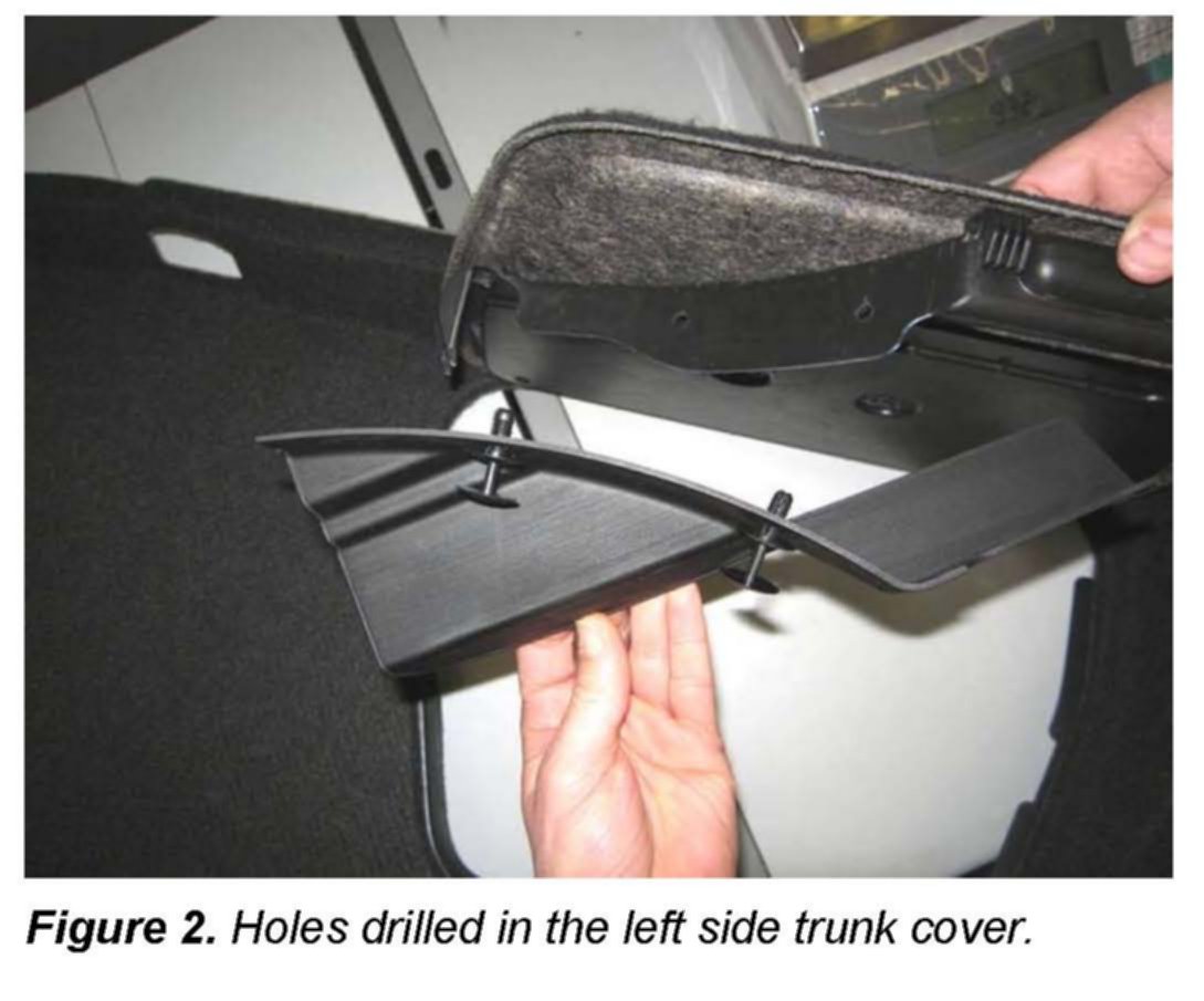 3. Using the deflector listed in the Required Parts and Tools section below as a template, drill three 6.5 mm holes in the left side trunk compartment cover.