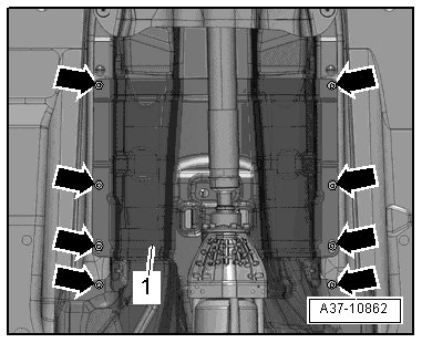- Remove the bolts - arrows - and remove the driveshaft heat shield - 1 -.