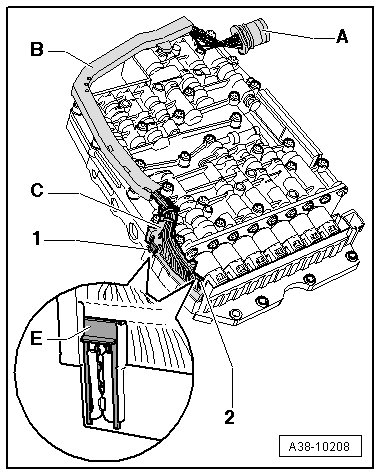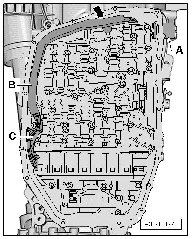 • To remove the Mechatronic, first remove the connector - C - and the wiring harness - B - from the Mechatronic. The wiring harness connector - A - remains installed in the transmission housing.