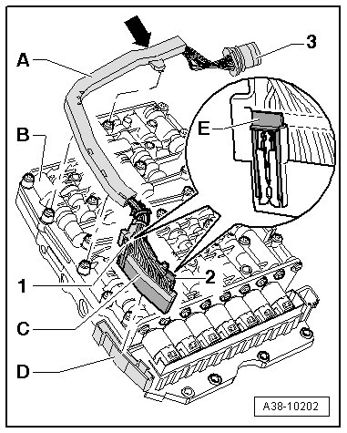 - Attach the wiring harness - A - to the Mechatronic. At the same time, insert the tab - arrow - on the back of the wiring harness into the Mechatronic unit.