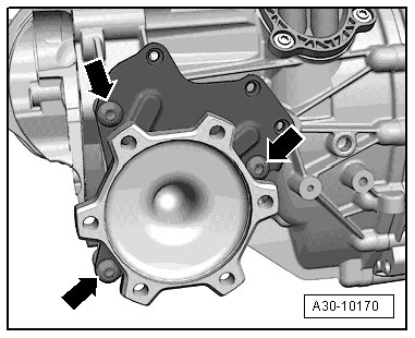 - Tighten the left flange shaft mounting bracket - arrows -. Tightening specification => [ (Item 29) Bolt ] Left Flange Shaft, Clutch Module, Spur Gears, Gearshift Shaft and Transmission Cover Overview.