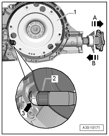 - Insert the left flange shaft into the transmission in the direction of - arrow B - and guide the end of the shaft - 2 - into the shaft seal on the front differential - arrow 3 -, keeping the shaft centered.