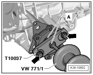 - Attach the plate from the (T10037) to the flange shaft - arrows - and attach the spindle from the (VW 771) (nuts - A -).