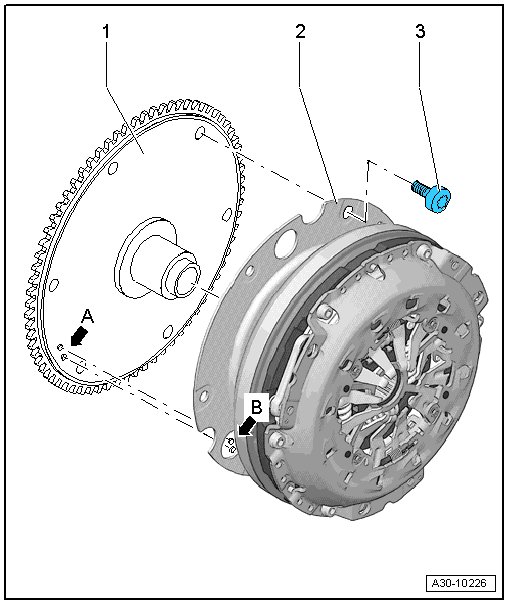 • The clutch may have noticeable function problems if the alignment pins for the drive plate - A - are not inside the hole in the clutch module - B -.