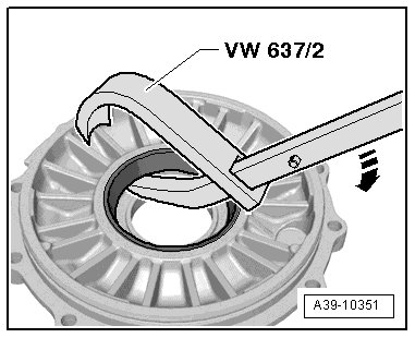 - Mount the (VW 637/2) alternating from side to side and pressing in direction of - arrow - and then carefully pry out the outer race / tapered roller bearing from the old final drive cover.