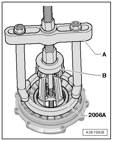 If it is not possible to remove the outer race / tapered roller bearing using the (VW 637/2) , then remove the outer race using the internal puller (Kukko 21/89) - B - and the counterholder (Kukko 22/4) - A -.