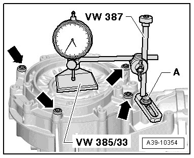- Position the dial gauge extension in the center of the end gauge (VW 385/33).