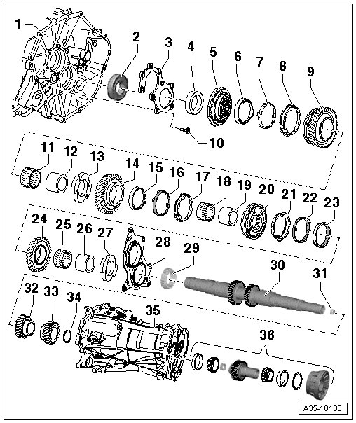 Shift fork group, input shaft, 1st, 2nd and reverse gear output shafts, removing and installing, refer to => [ Shift Fork Group, Input Shaft, 1st, 2nd and Reverse Gear Output Shafts Overview ] Shift Fork Group, Input Shaft, 1st, 2nd and Reverse Gear Output Shafts Overview.