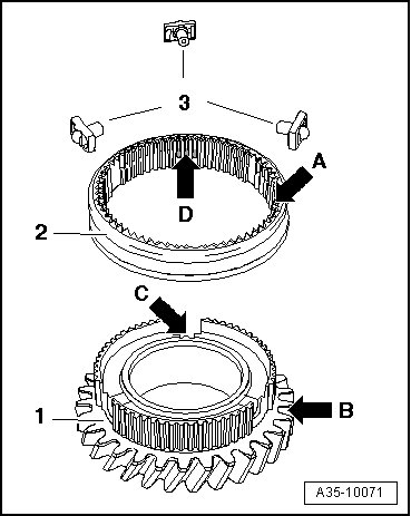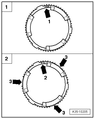 - Mount the locking collar - 1 - over the synchronizer hub - 2 - so that the wire tooth spacing on the locking collar - arrow A - and on the synchronizer hub - arrow B - align with each other.