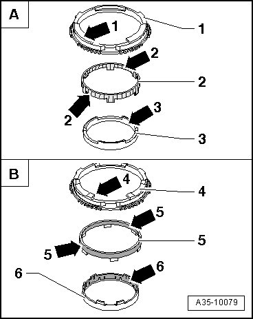 Differentiation of Reverse Gear Synchronization Rings - A - and 1st/2nd Gear - B -