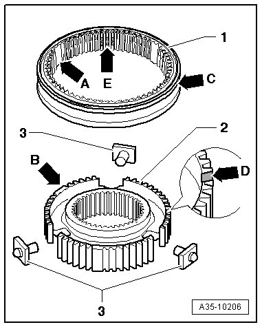 - Then place thrust pieces - 3 - in synchronizer hub and press thrust pieces into notches - arrow E - in the locking collar.