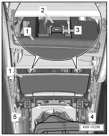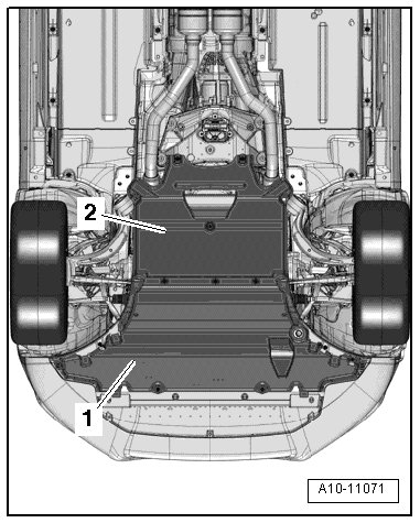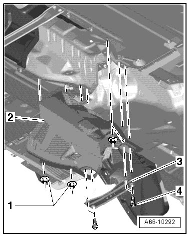 - Remove the rear noise insulation by loosening the fasteners - 2 - and - 3 -.