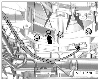 - Install the starter and tighten the bolt - 1 - from the engine side. Tightening specification.