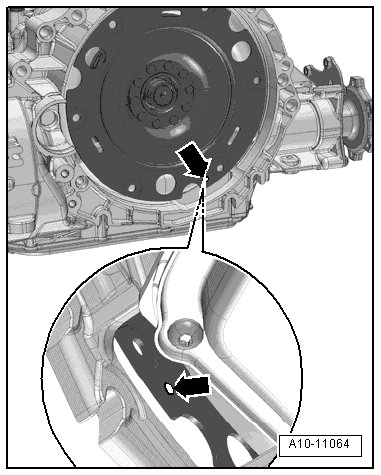 • The check hole - arrow - must be visible in the transmission housing cut-out.