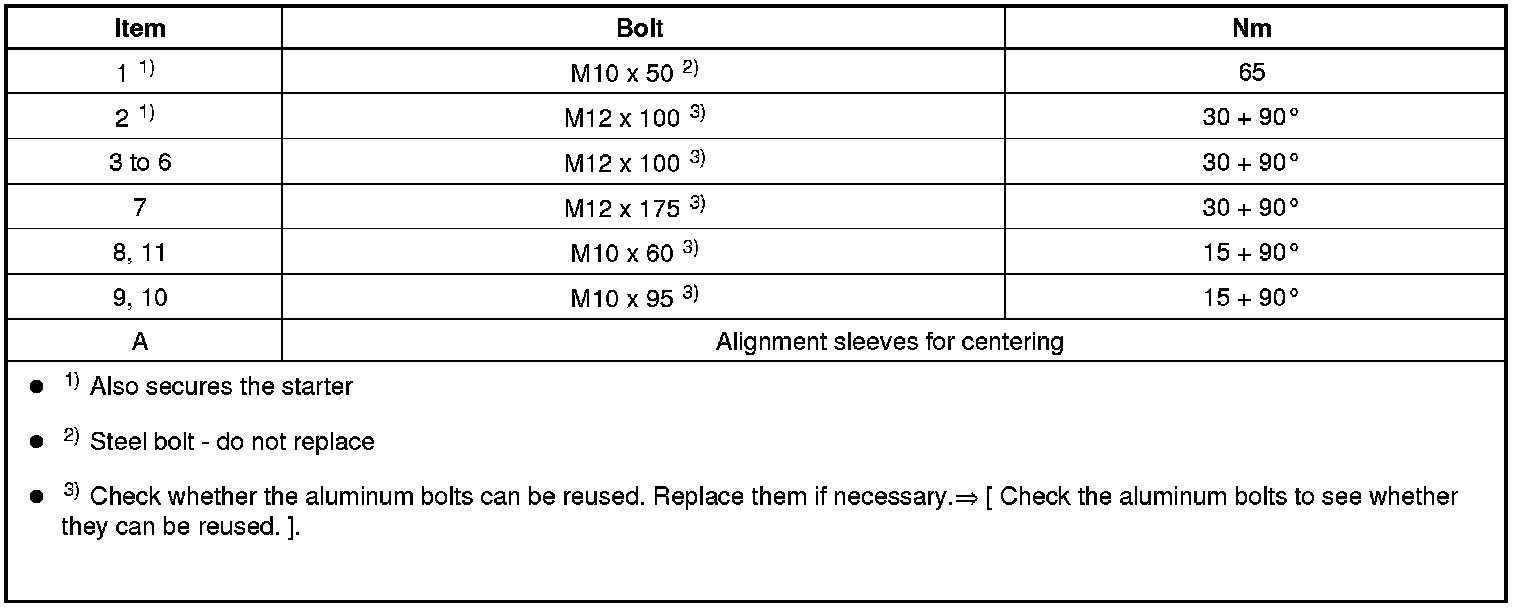 - Attach the transmission to the engine and tighten the bolts - 3 through 11 -.