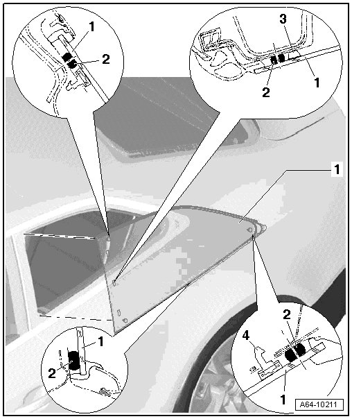 - Press the new window in with the securing pin on the C-pillar and then insert it in the window opening and secure it to the B-pillar using adhesive tape.
