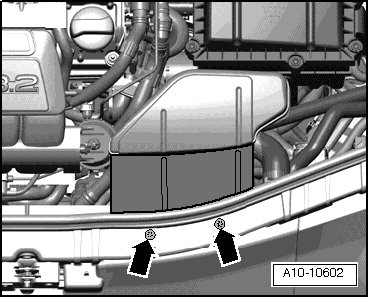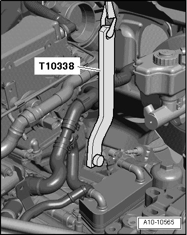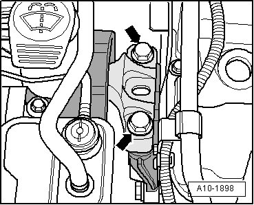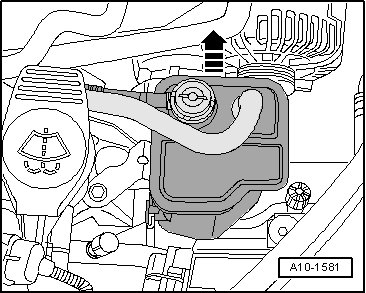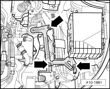 - Pull the EVAP canister in the engine compartment together with the connected hoses upward out of the bracket - arrow - and lay it to the side.