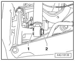 - Remove bolt -1- and remove parking brake cable -2- from bracket of brake cable.